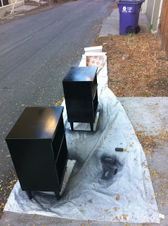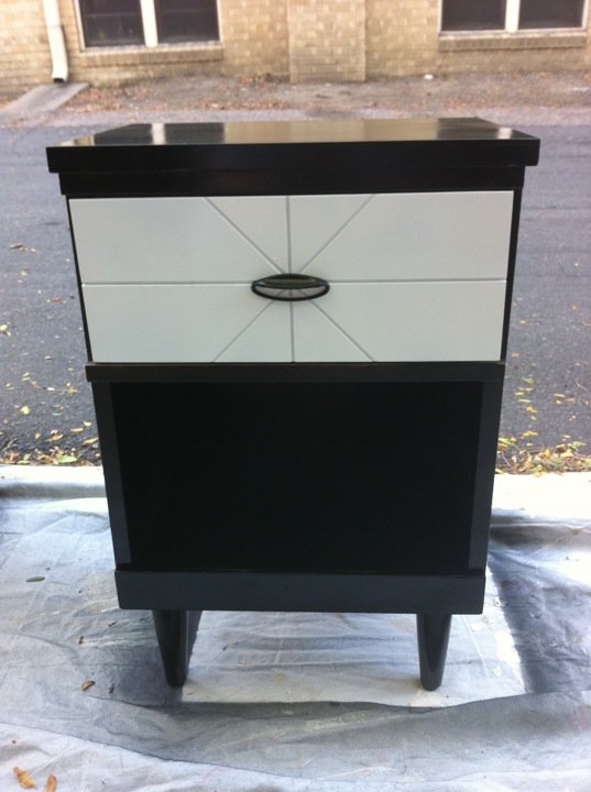 I was looking for 2 mid-century looking bedside tables for my master bedroom.  We'd been using silver TV trays for years!  Finally after months of looking off & on I came across something promising.  They were $20/each & the shape & size I was looking for.  I had to do the dreaded deed of driving out to the Suburbs...which I HATE...but I did it.  I forgot to take a before picture but just picture dark brown laminate.