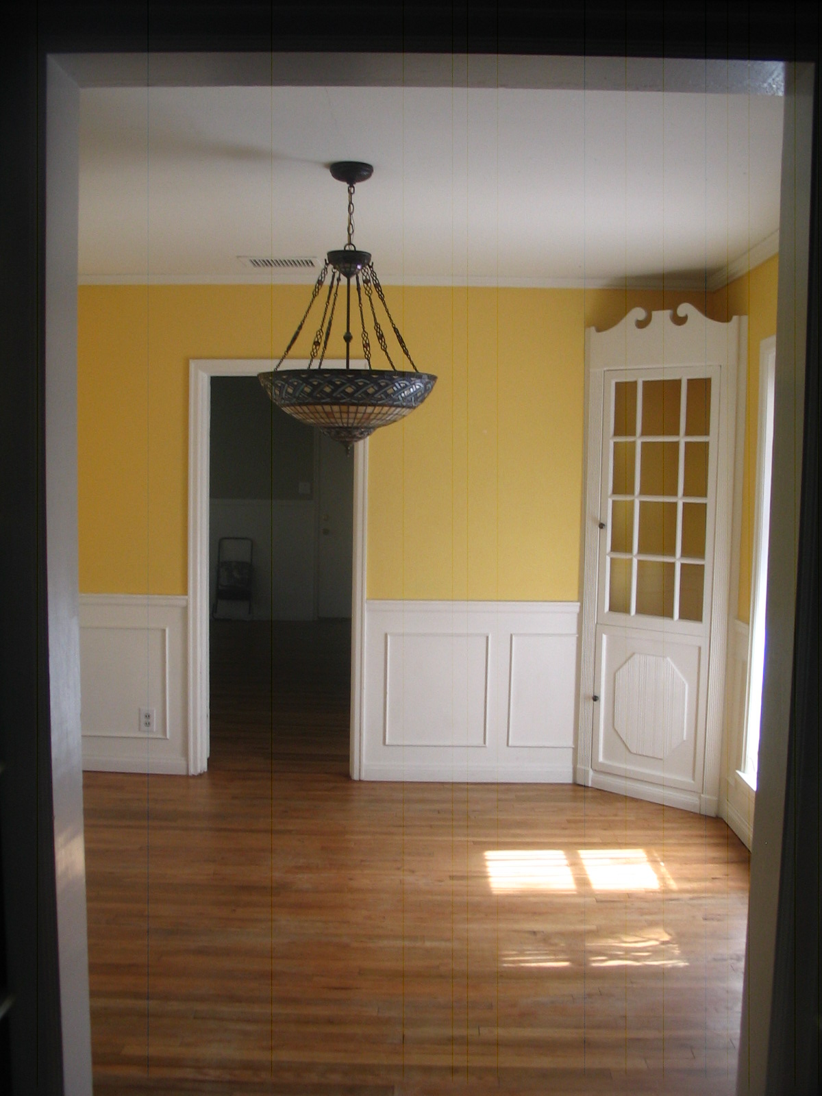 Dining Room (Scraped off wallpaper & popcorn ceilings, replaced chandelier, painted every surface & refinished the floors after ripping out the carpet).
